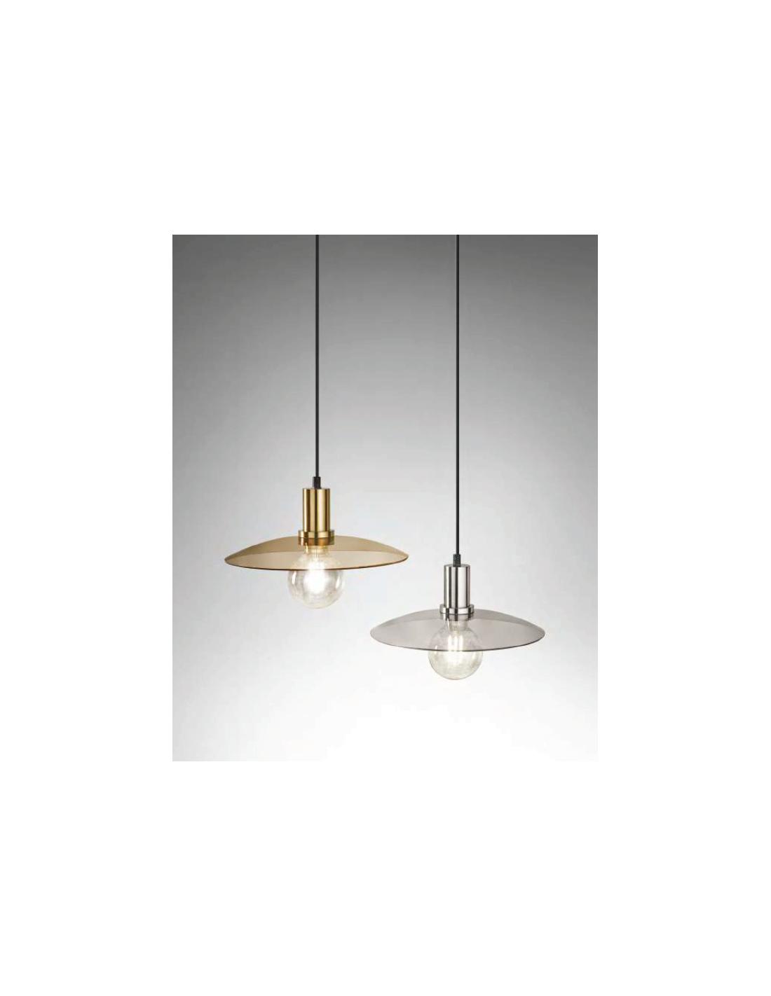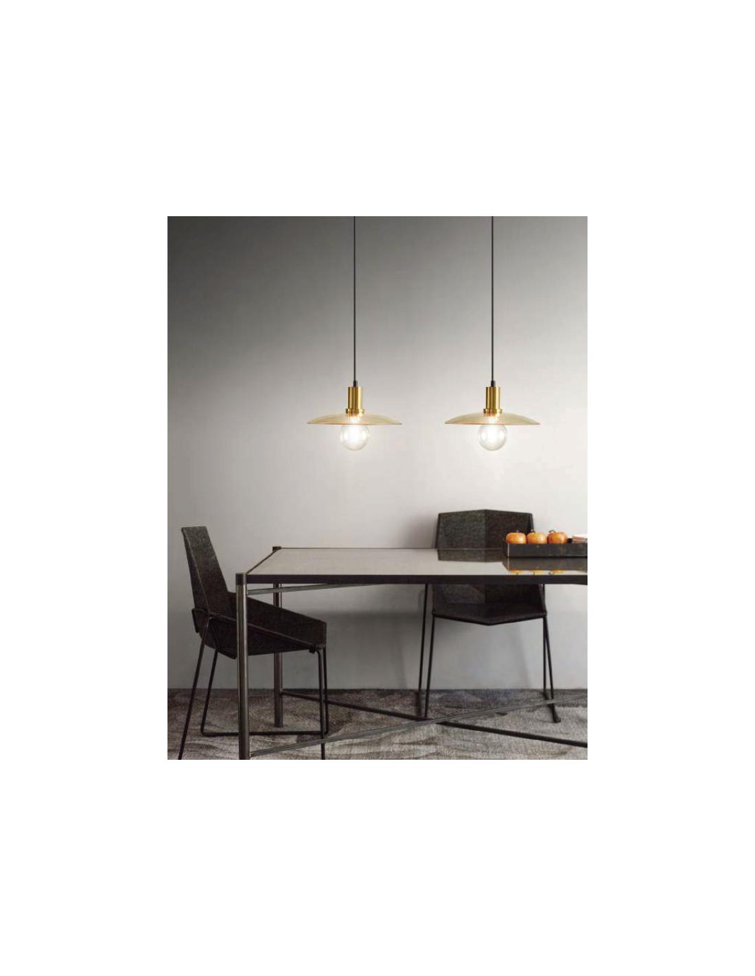 Suspension lighting with iron frame. Finishes in brass with transparent amber glass diffuser.