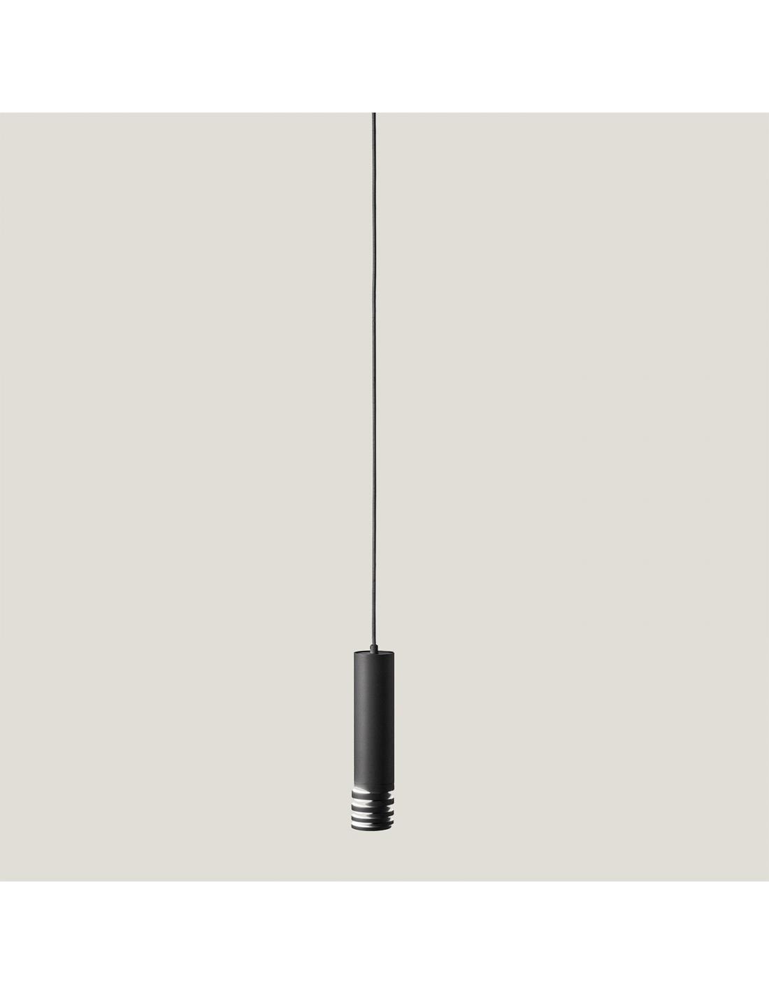 Minimal chandelier in its dimensions, with lighting facing downwards only, a small cylinder suitable for lighting as a single light point or in multiple version. An ideal suspension for tables, peninsulas, desks that gives concentrated and direct lighting.