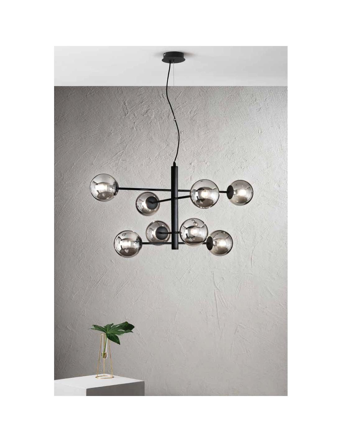 The spheres are in blown glass of amber color in the gold version and smoked in the black version, each of them has a bulb with E14 fitting inside.