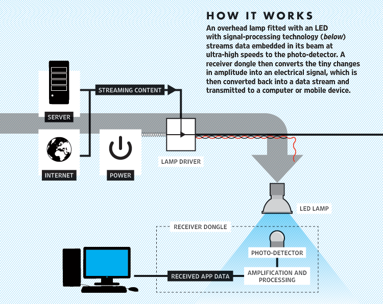 How does it work? The flow of data coming from the Network or a Lan is encoded and modulated by a software able to turn it into pulses of light. What acts as the issuer wireless is a LED lamp capable of emitting thousands of pulses per second and to ensure, in this way, the transmission data. To receive the pulses emitted are a receiver of light pulses, was able to detect and decode the transmitted signals and sending them to a software which takes care of processing them and converting them into electrical signals. These signals should then be read without difficulty from any computer or mobile device.