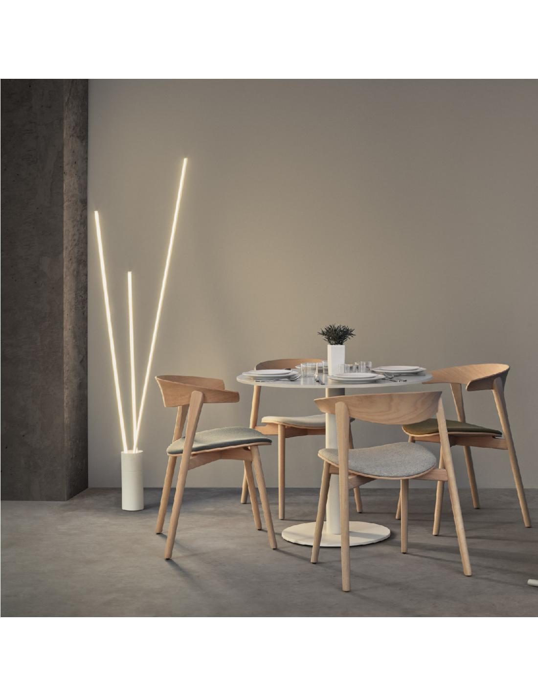 Integrated LED floor lamp consisting of a cylindrical base from which 3 lines of light that can be adjusted in position and orientation of the light branch off.
