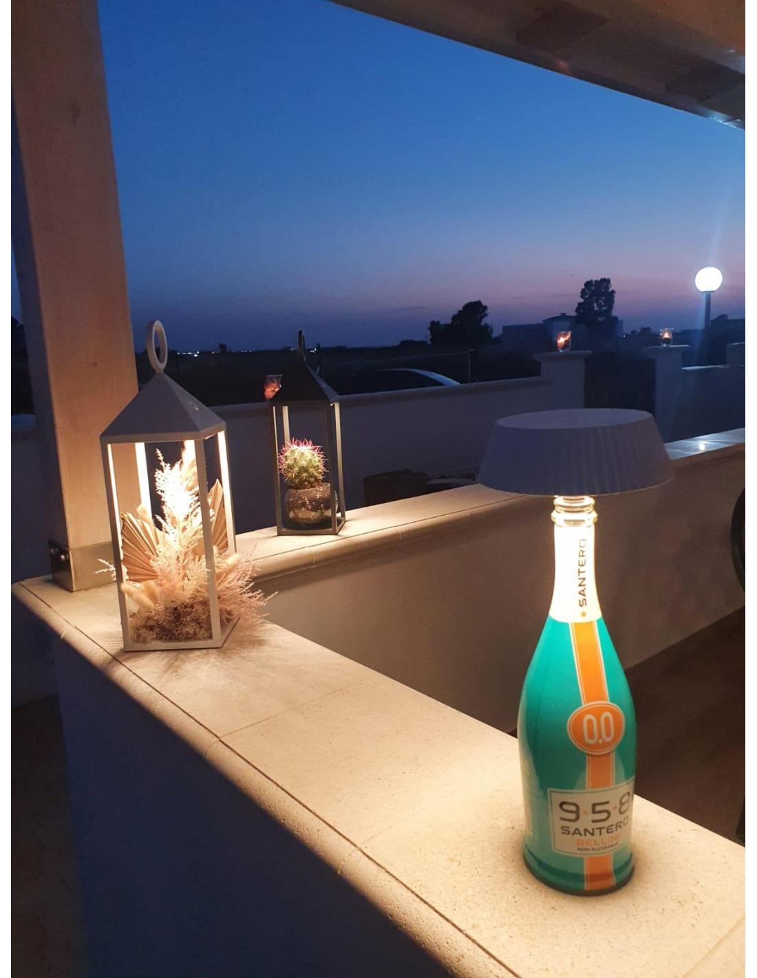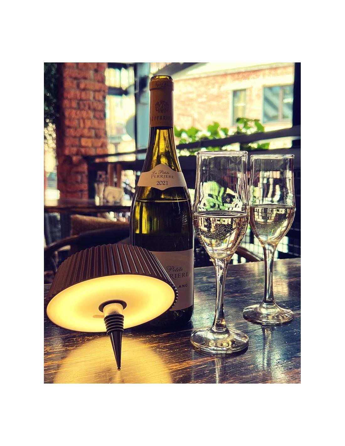 Rechargeable table lamp (duration 9h) with a particular structure that allows it to be used also as a luminous bottle cap. Lamp that can also be used outdoors.