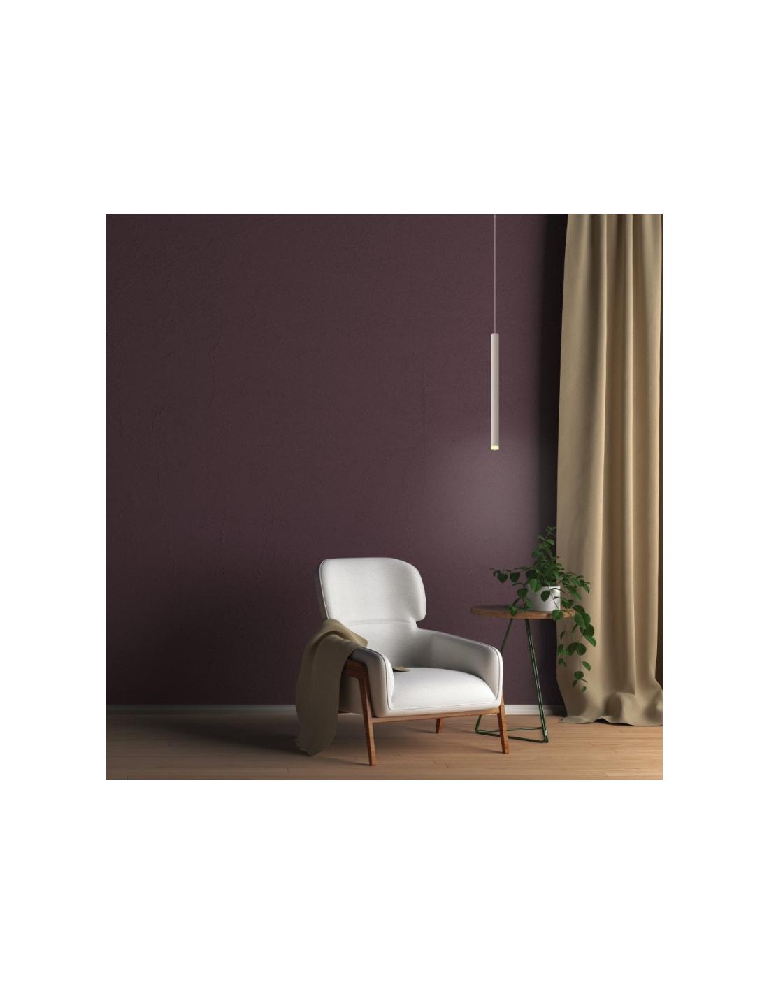 Tubular suspension lamp with golden aluminum structure and integrated LED light.