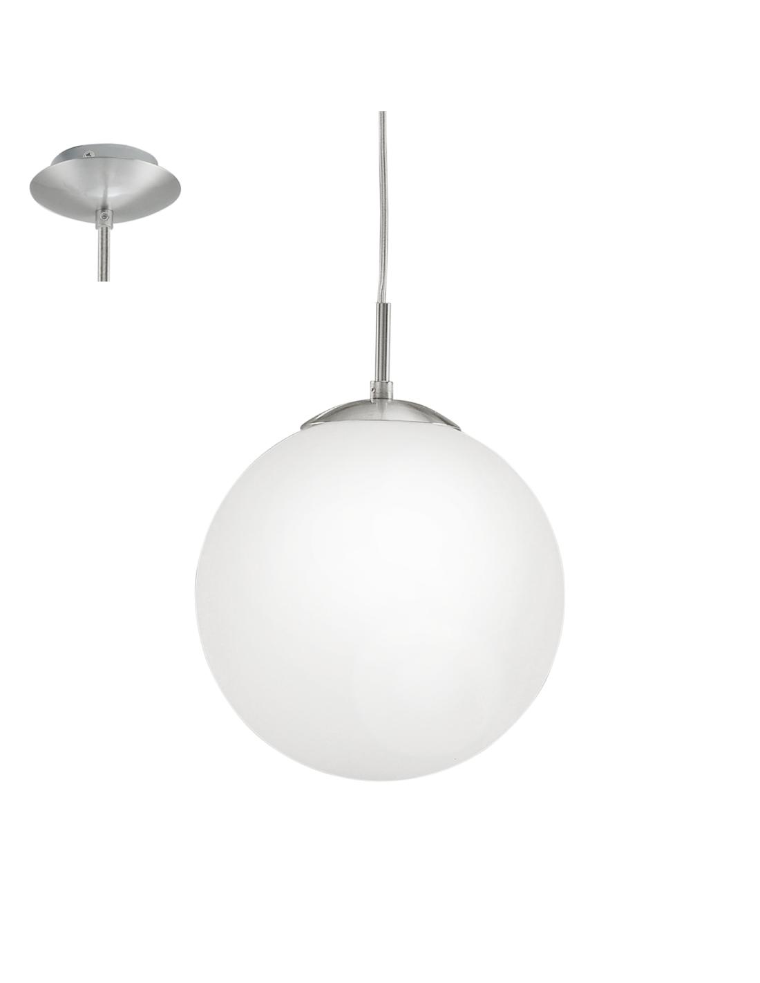 Suspension lamp Rondo By Eglo. Diameter 30cm, 1x60W, Attack E27. Steel body , colour: Nickel matt. Shade in opal glass, white in color.