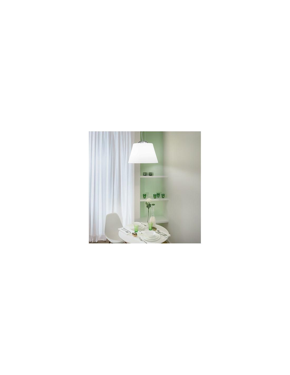 Suspension lamp whose constituent materials are white blown glass and satin-finished metal frame.