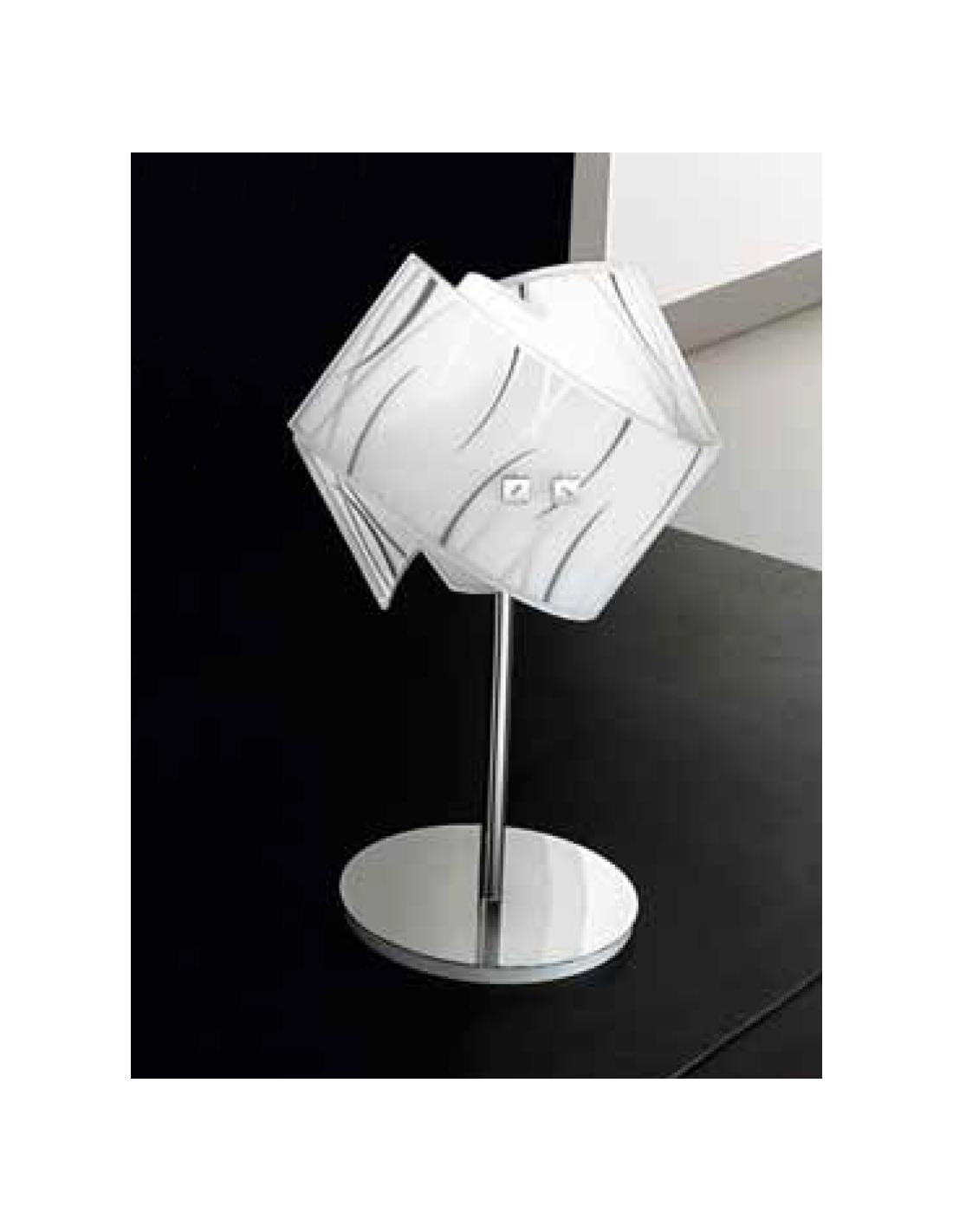 Table lamp with metal frame. Chrome finishing. Diffuser in screen-printed glass with white screen-printed glass and decorated with white, orange or black. Satin finish.
