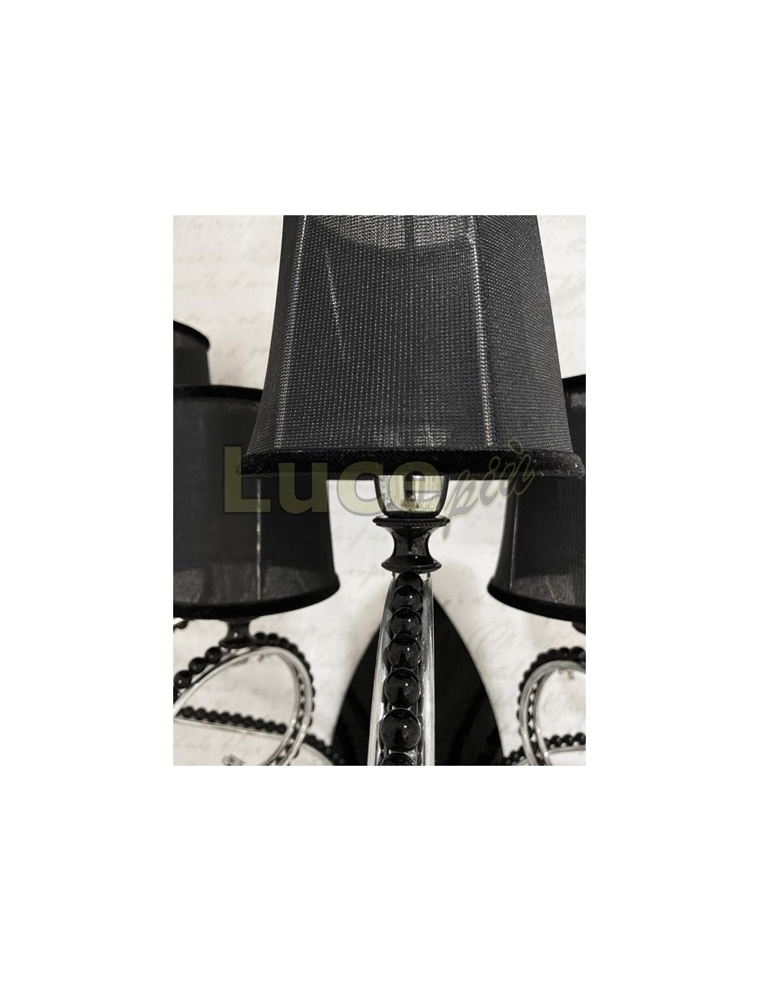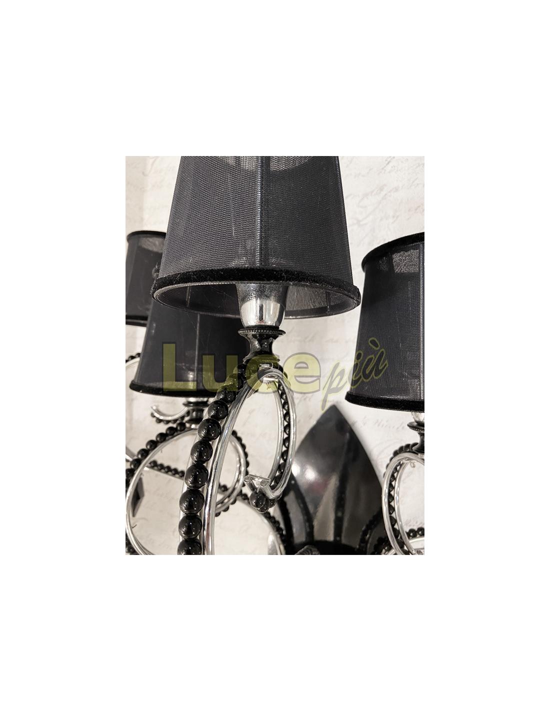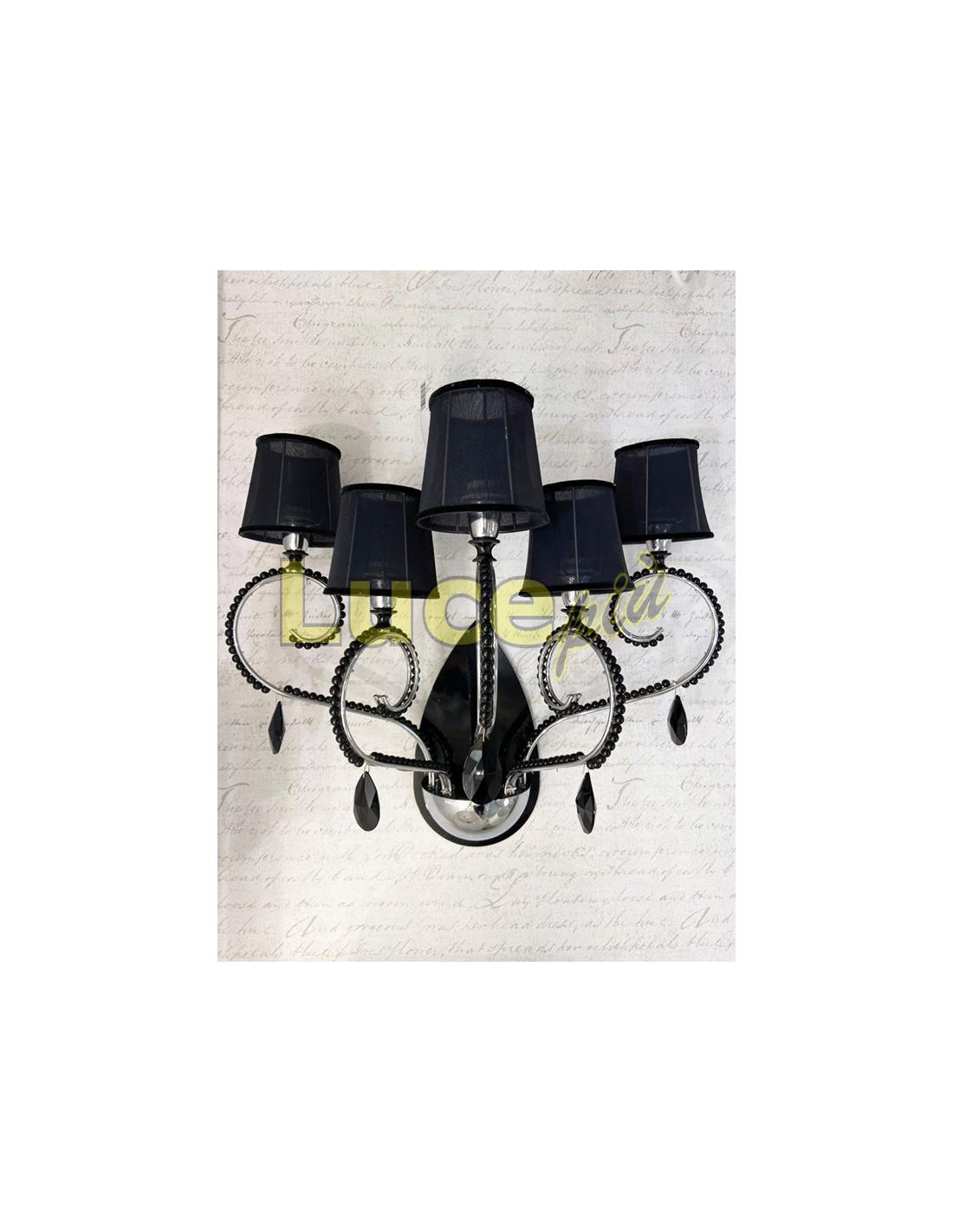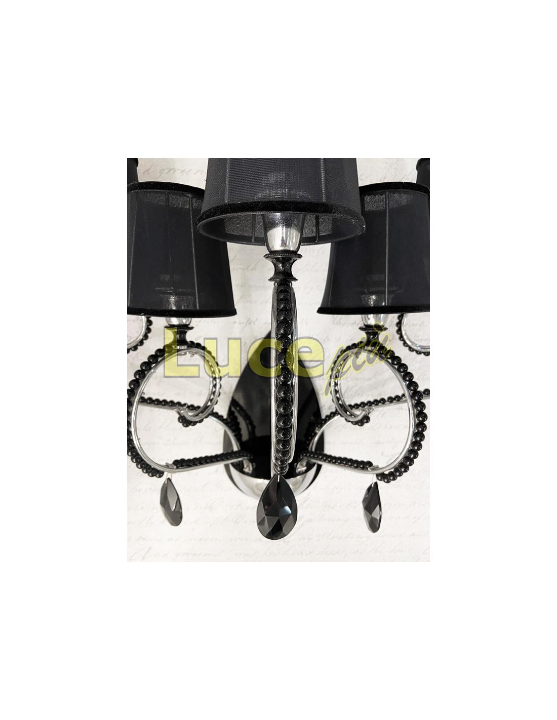 This version of the series is a 5-light wall lamp. The arms of the lamp are in chromed metal and describe sinuous movements accompanied by small shiny black crystals and black pendants. The lights are covered by fine black fabric lampshades with a velvet finish at the ends. The base adhering to the wall is in glossy black metal.