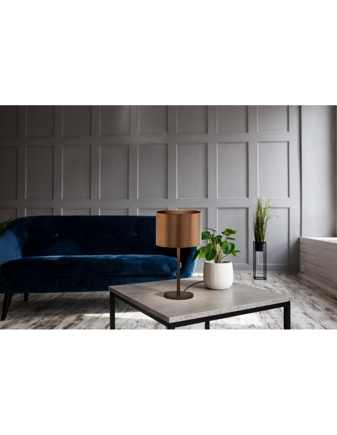 The SAGANTO 1 table lamp is composed of a brown metal base and a brown plastic lampshade with a satin metal effect and copper-colored interior.