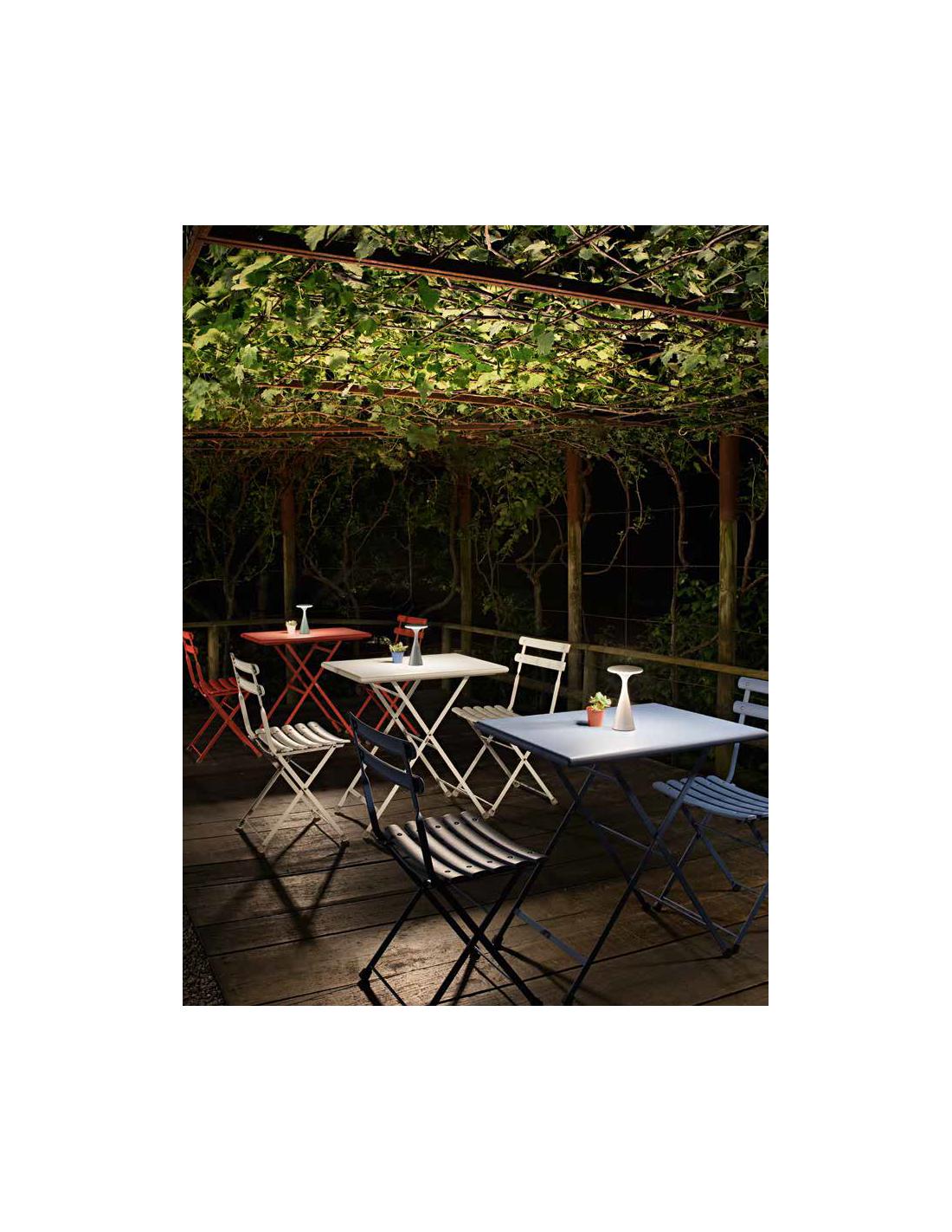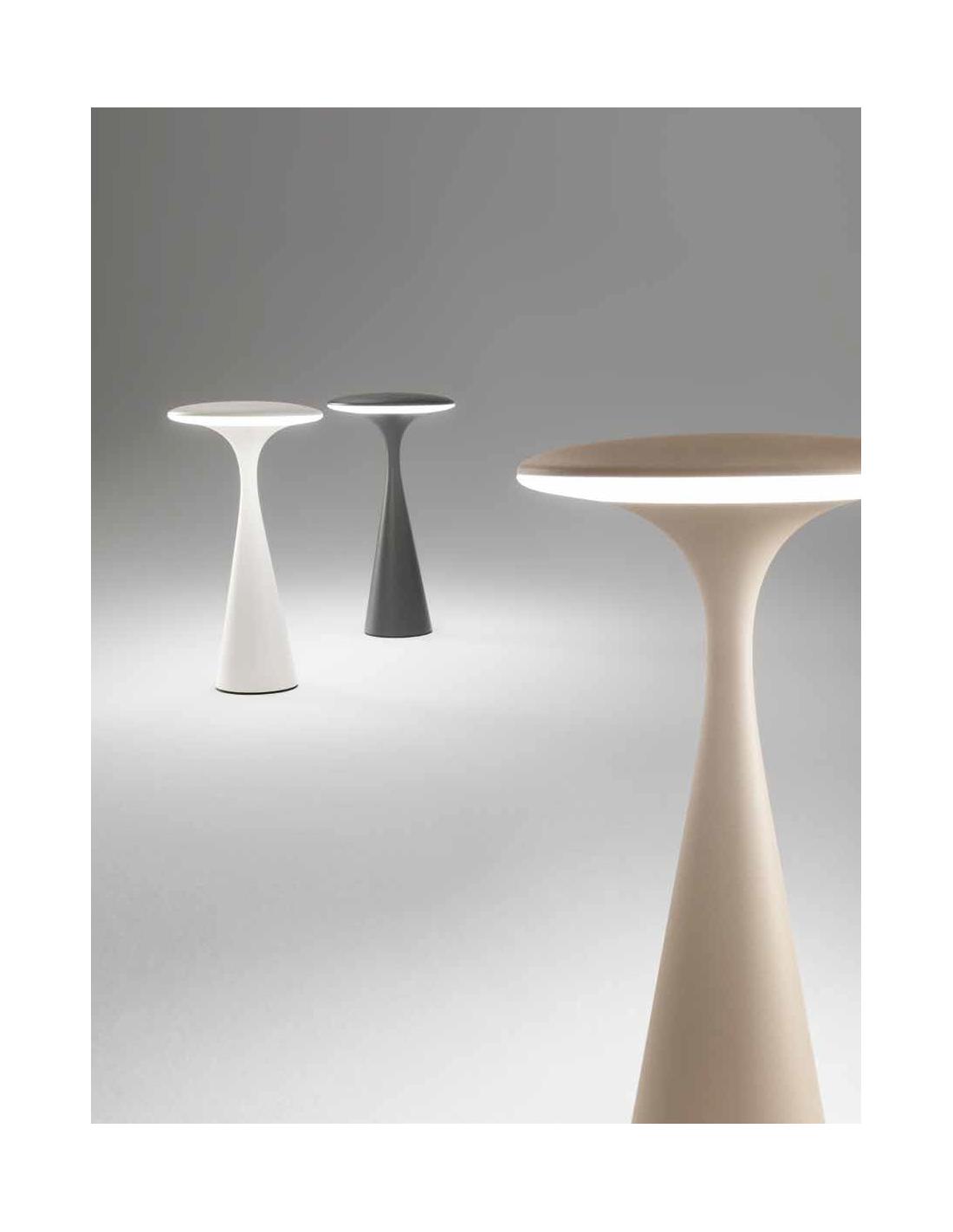Lampada da tavolo ricaricabile in lluminio pressofuso verniciato a polvere per uso interno o esterno. Diffusore in acrilico satinato.