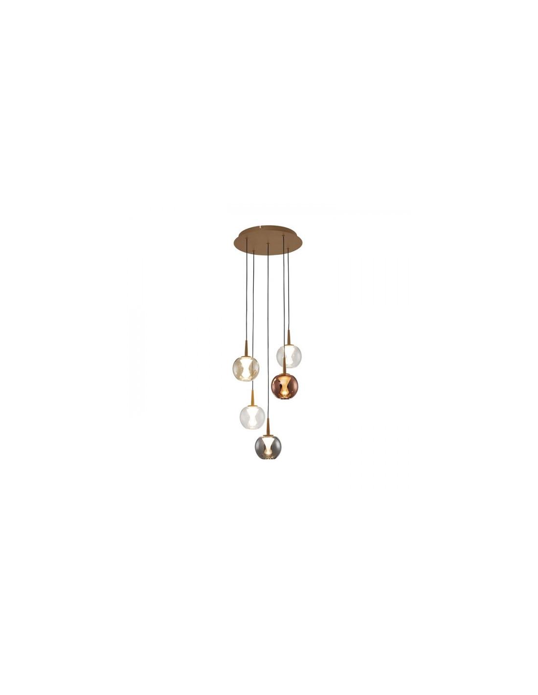 Il lampadario presenta una struttura in metallo oro opaco e cinque punti luce in vetro di vari colori (rame, cromo, bronzo, trasparente, bianco latte) che garantiscono un’illuminazione ampia, uniforme e confortevole, ideale per creare atmosfere accoglienti e di grande impatto visivo.