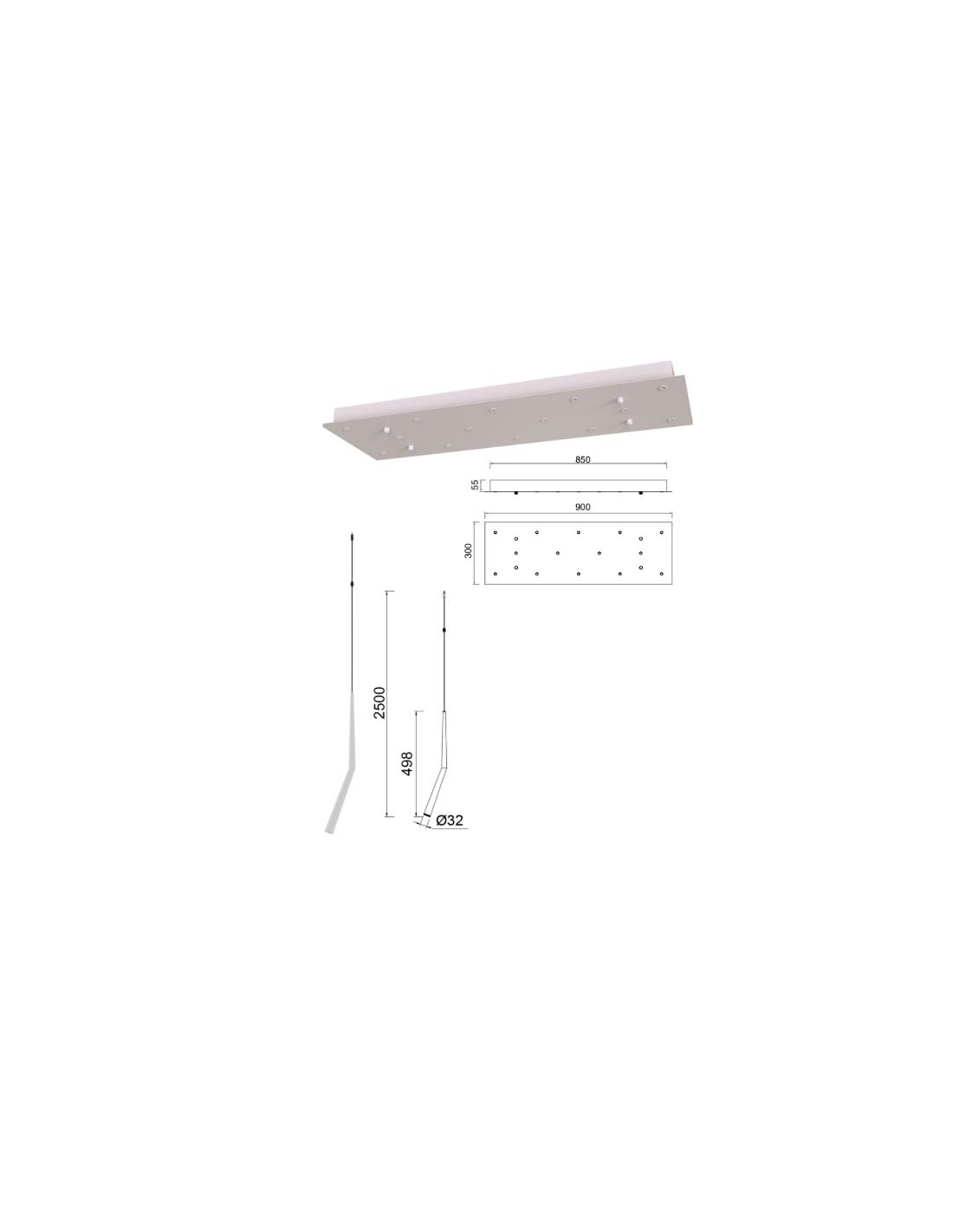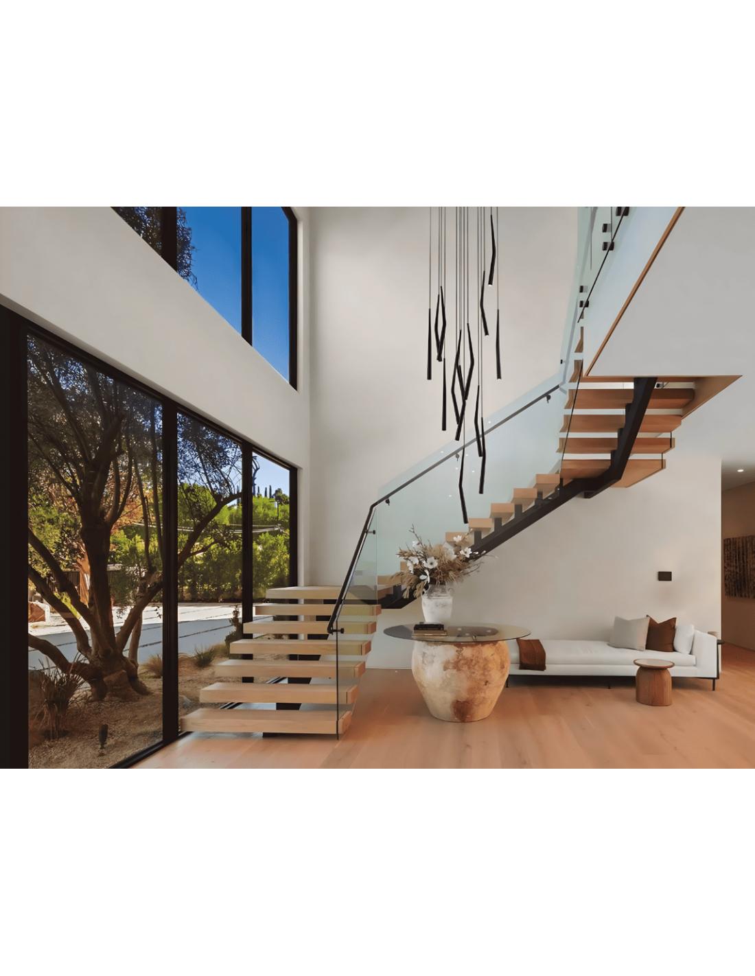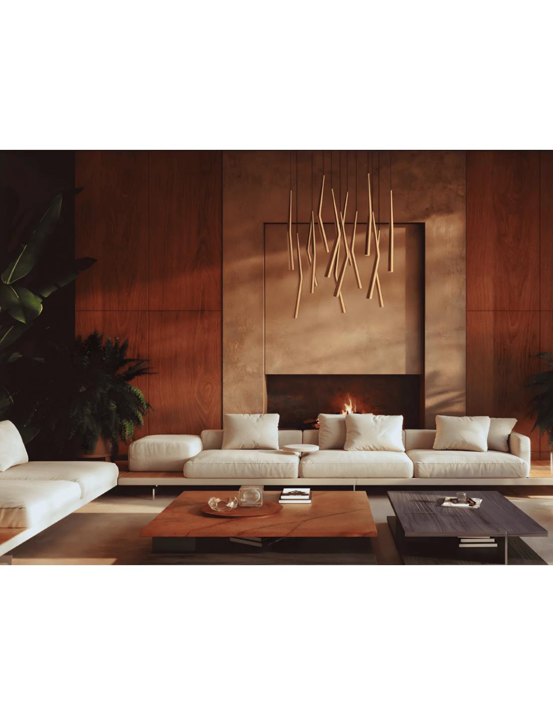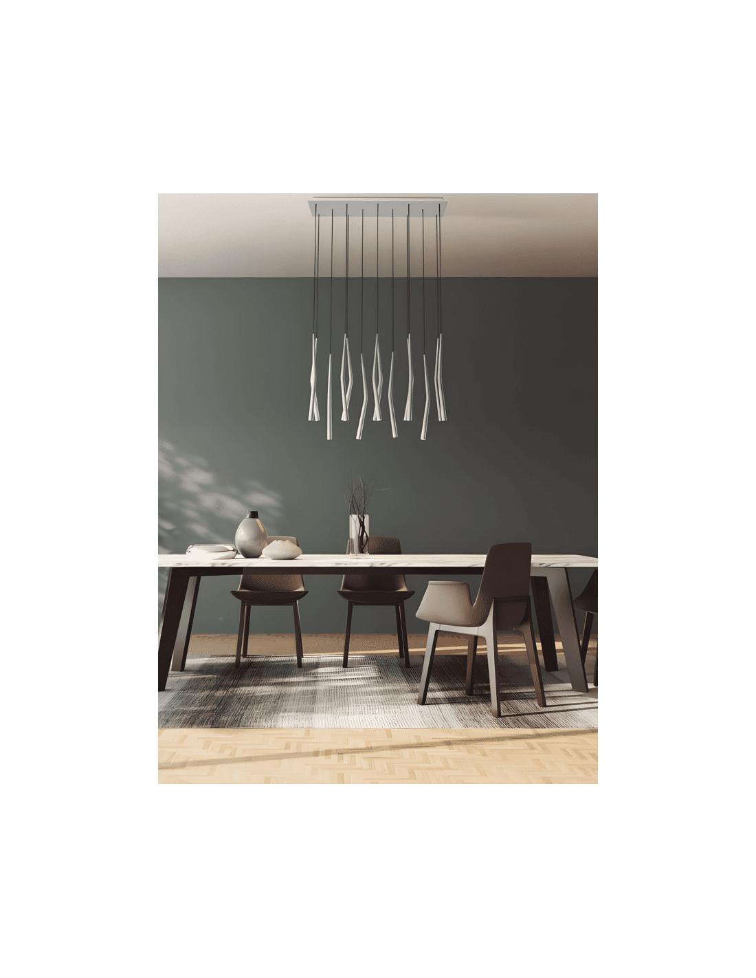 I sottili elementi pendenti dotati di LED integrato da 4,5W con luce calda 3000K, sospesi a diverse altezze, creano un elegante gioco di volumi che dona movimento e leggerezza all’ambiente. La distribuzione dei corpi luminosi consente un’illuminazione diffusa e scenografica, ideale sia come luce principale sia come elemento decorativo centrale sopra il tavolo.