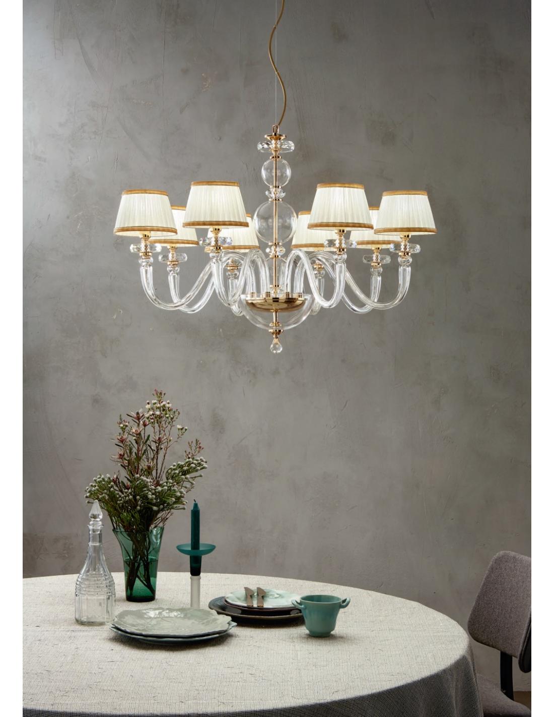 Lampadario da sospensione in vetro lavorato a mano con dettagli metallici cromo. 8 luci.