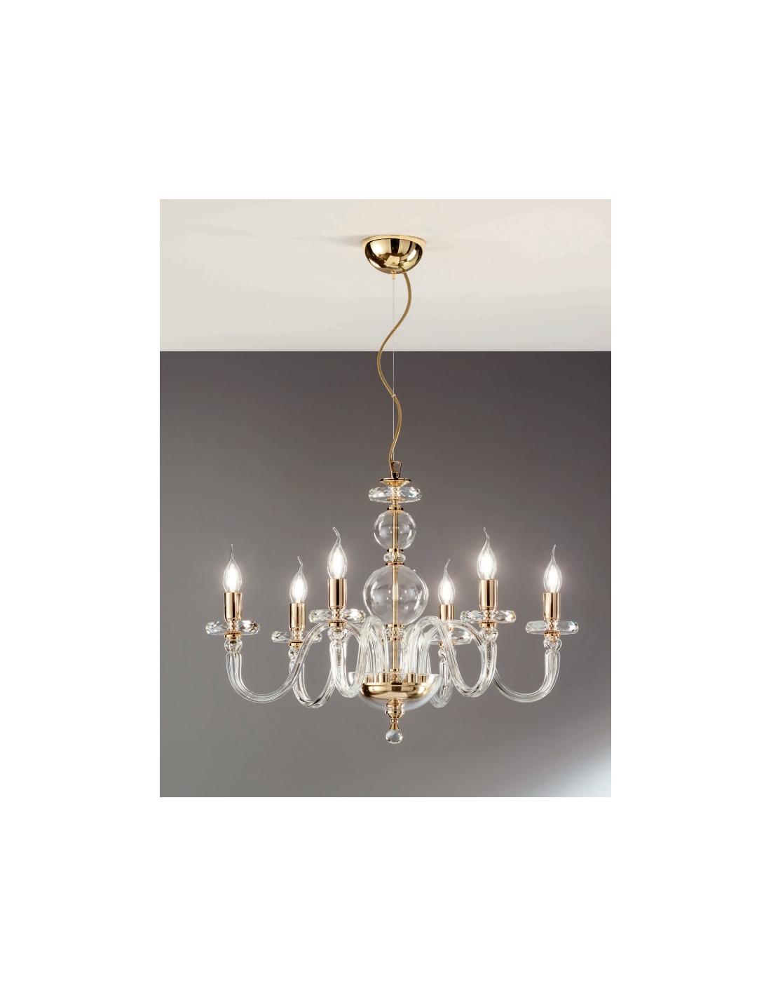 Lampadario in vetro lavorato a mano con 6 bracci che terminano in 6 luci, attacco E14. Finiture in metallo. Cavetti in acciaio regolabili in altezza. Il colore è Oro come nella foto. Dettagli in cristallo ottico.