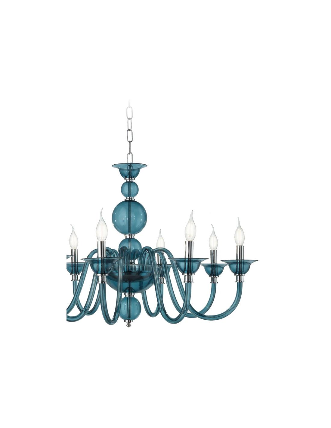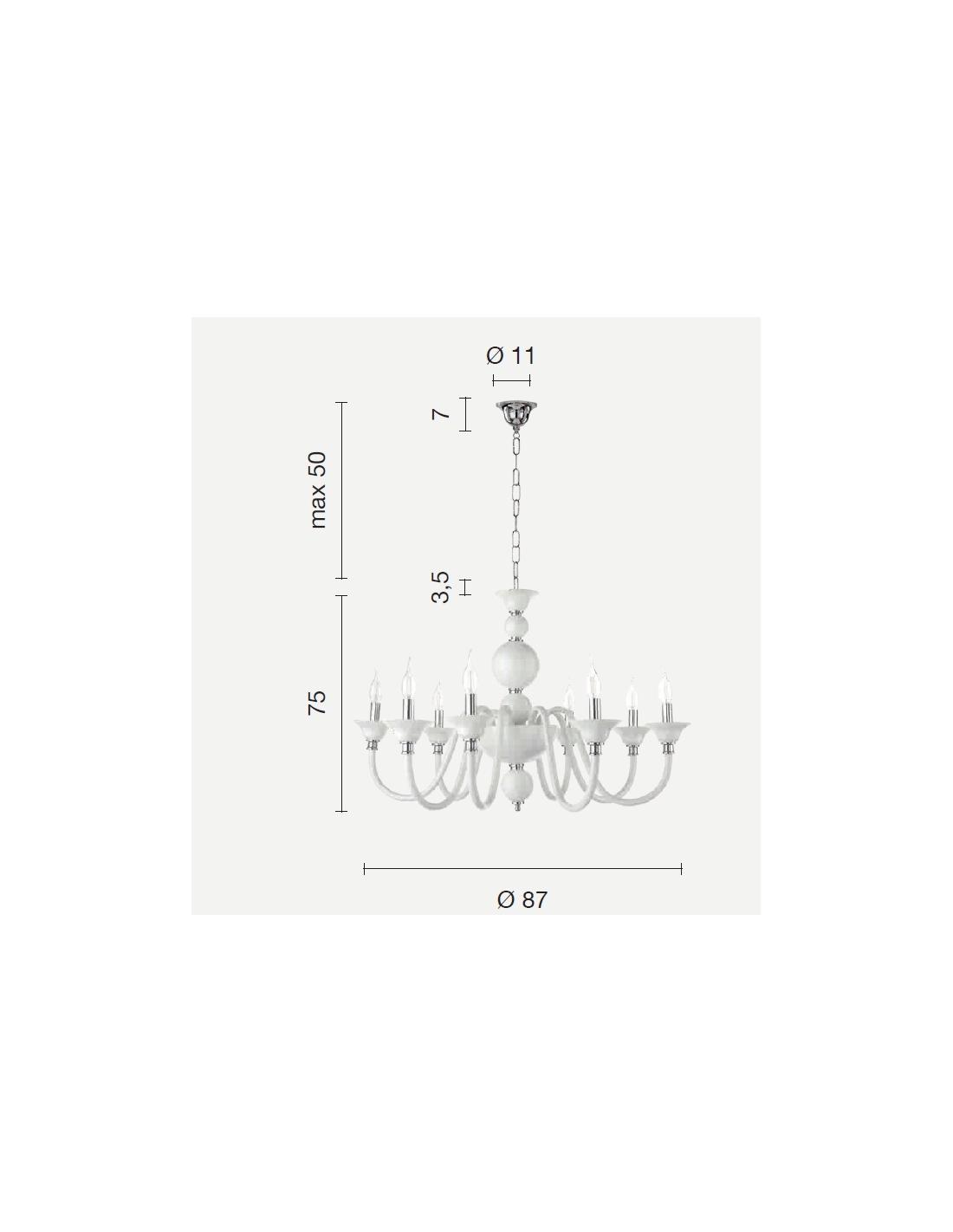 Lampadario in vetro lavorato a mano con 8 bracci che terminano in 8 luci, attacco E14. Dettagli in cristallo ottico. Finiture in metallo. Cavetti in acciaio regolabili in altezza. Il colore è bianco lucido / bianco latte come nella prima foto. La dimensione è quella della seconda foto, 8 bracci disposti tutti sullo stesso piano.