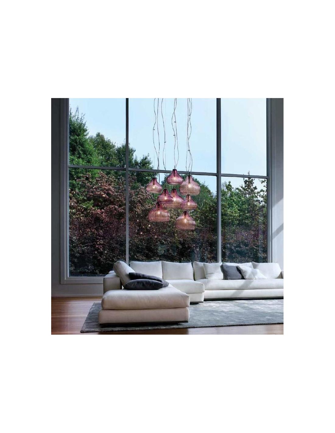 Lampade da soffitto disponibili in diverse dimensioni e luci con bracci sagomati a mano in acciaio verniciato a polveri epossidiche e diffusori in vetro satinato.