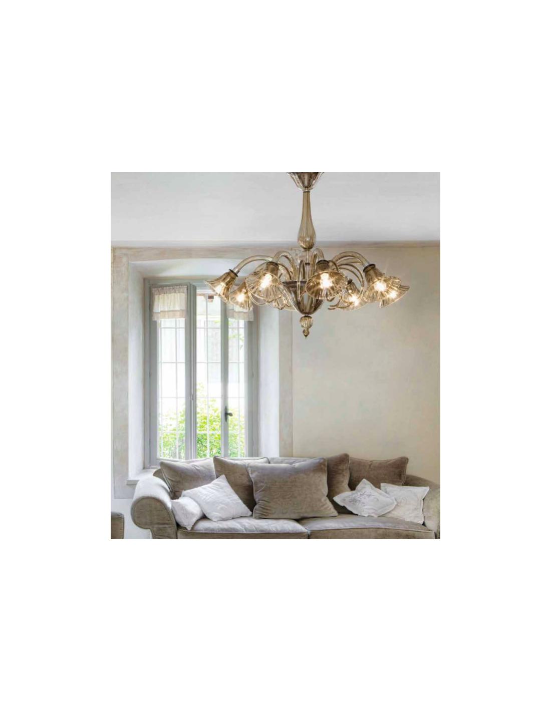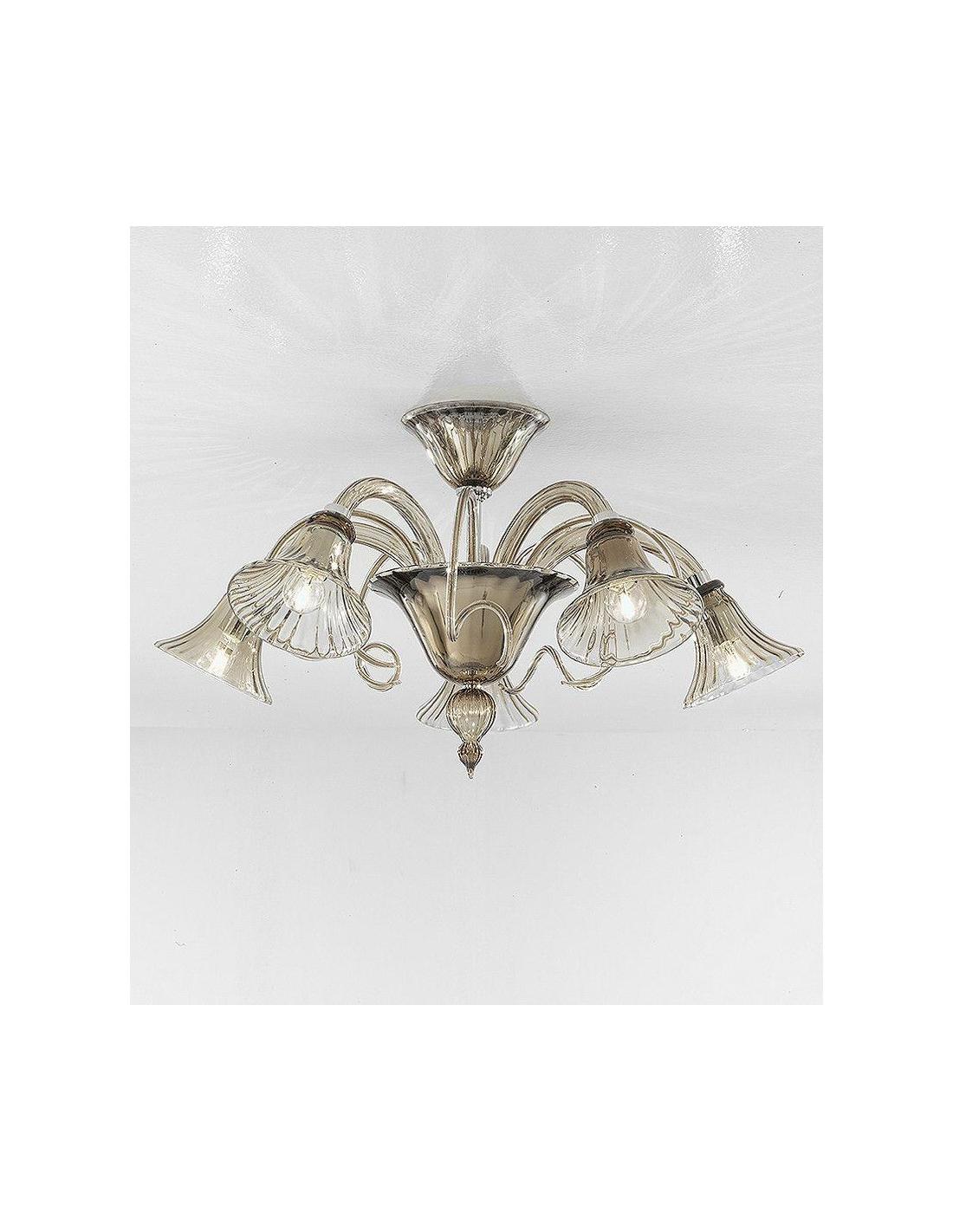 Lampada a sospensione dalla struttura in metallo e vetro soffiato color fumé.