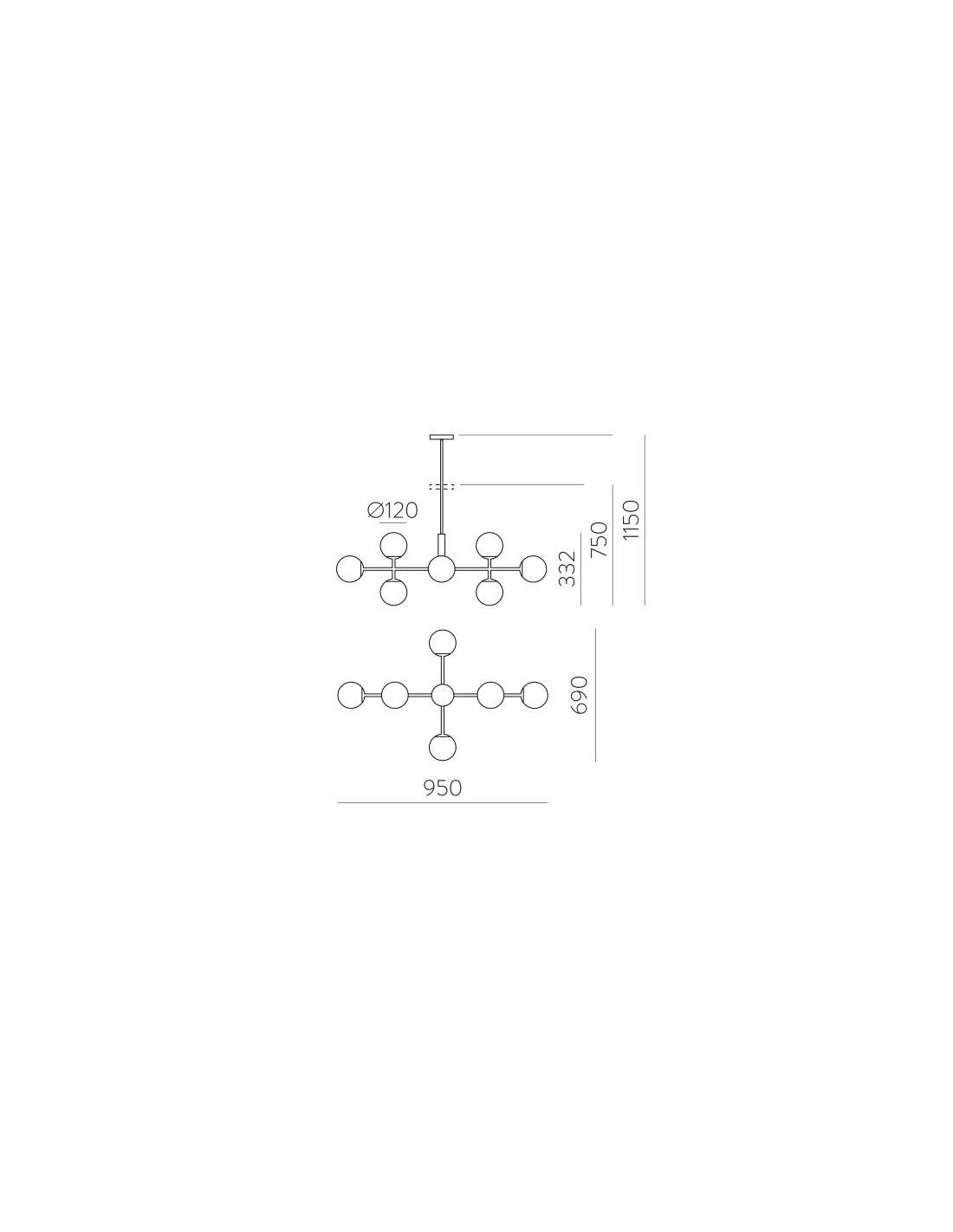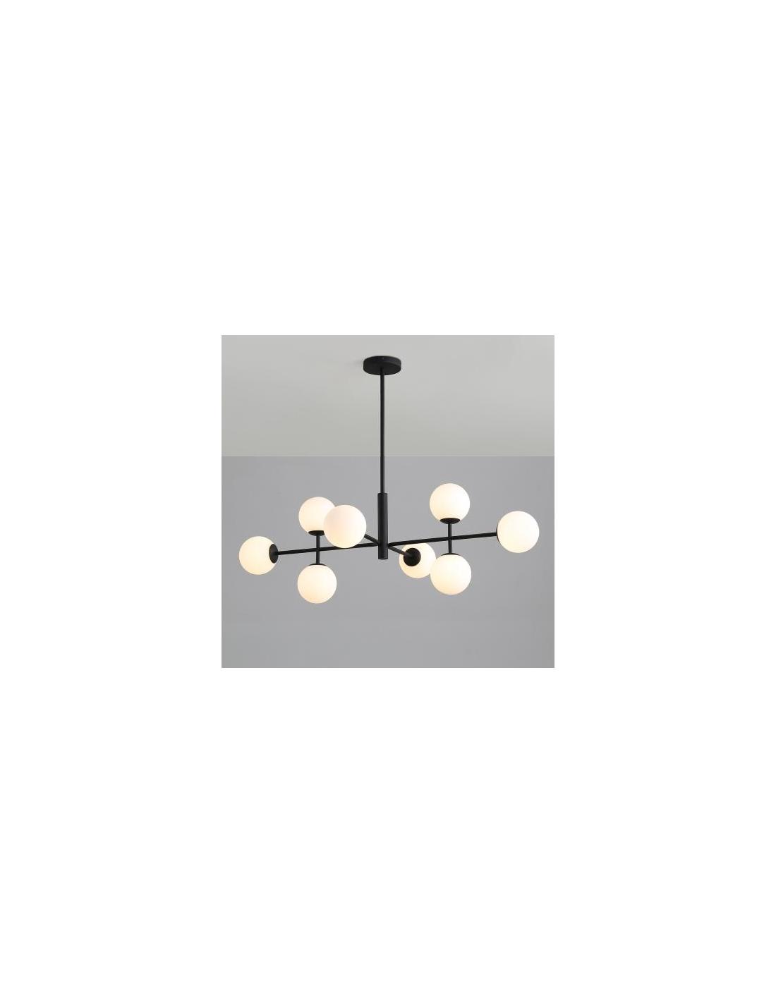 Il lampadario a sospensione DORIS presenta una montatura in metallo di colore oro e 8 diffusori realizzati in vetro bianco opale dalla forma sferica.