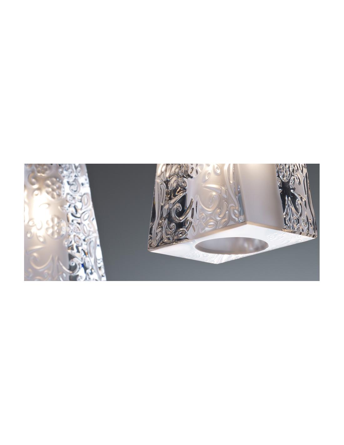 Vicky ha un carattere forte che traspare dalla luce modellata dalle decorazioni floreali di stile indiano impresse nel cristallo, un segno dolce sull’ornamento trasferito alla produzione industriale. Una rottura al minimalismo. Il designer dello studio Nicola Design spiega: “Vicky contamina gli spazi raffreddati ed influenzati dall’omologazione che in questi anni ci circondano, è una collezione in cromo e cristallo, una fusione tra tecnologia, arte e design. Questa collezione si caratterizza da una grande modernità nelle linee e scelte tecnologiche e una grande maestria nella produzione del cristallo”. La collezione è disponibile con sospensioni, lampade da tavolo, da parete e soffitto per interno. I diffusori sono in cristallo, le strutture in cromo lucido. Le versioni da tavolo sono dotate di un paralume in tessuto bianco o nero provviste di doppia sorgente luminosa con conseguente doppia accensione. Per tutte le tipologie c’è la possibilità di montare il vetro capovolto per creare composizioni libere. L’elettrificazione è a tensione di rete per lampade alogene.