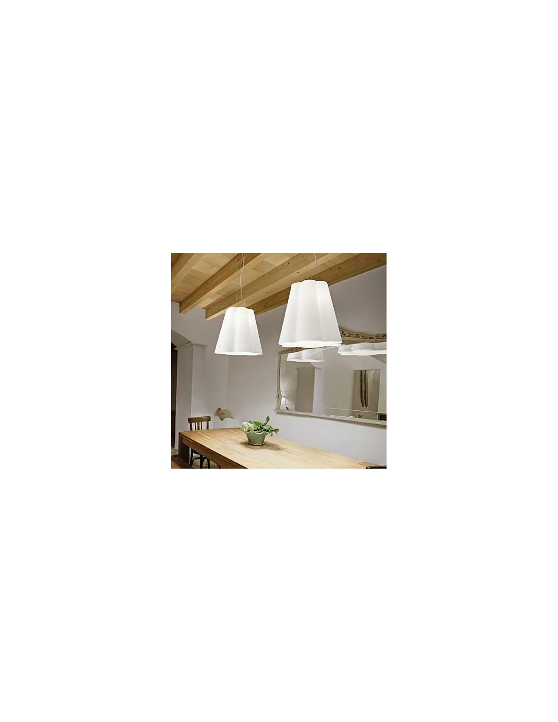 Sospensione in metallo e alluminio verniciato a polvere colore bianco opaco con diffusore in silicone, cavi regolabili in lunghezza.