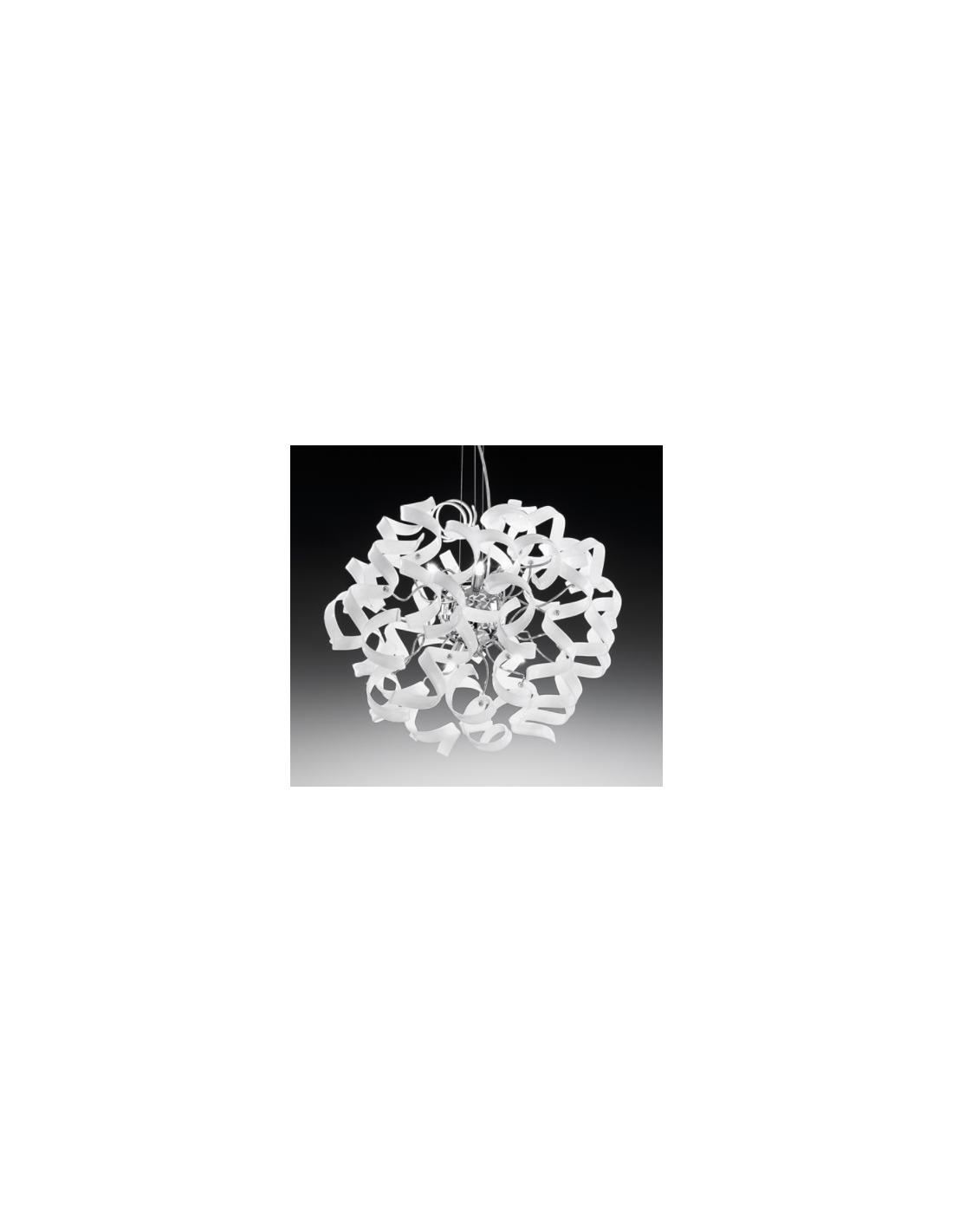 Lampadario con struttura in metallo cromato e 12 riccioli di vetro bianco. Disponibili anche altri colori.