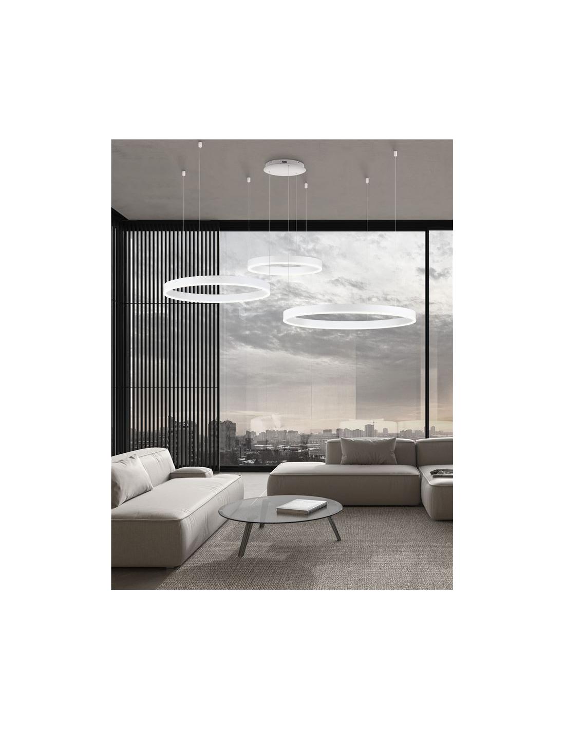 Il Nova Luce Motif ø60-80-100cm è un lampadario a sospensione che combina tre cerchi luminosi di diverse dimensioni, creando un effetto scenografico e moderno. Il suo design minimalista lo rende perfetto per arredamenti contemporanei, mentre la finitura bianca esalta l’eleganza della struttura.