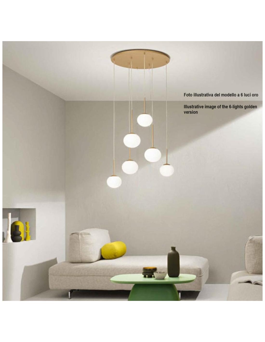 Questo lampadario a sospensione JEWEL di Ondaluce è composto da una piastra rotonda in metallo verniciato oro da cui pendono 6 diffusori a sfera in vetro soffiato bianco satinato.