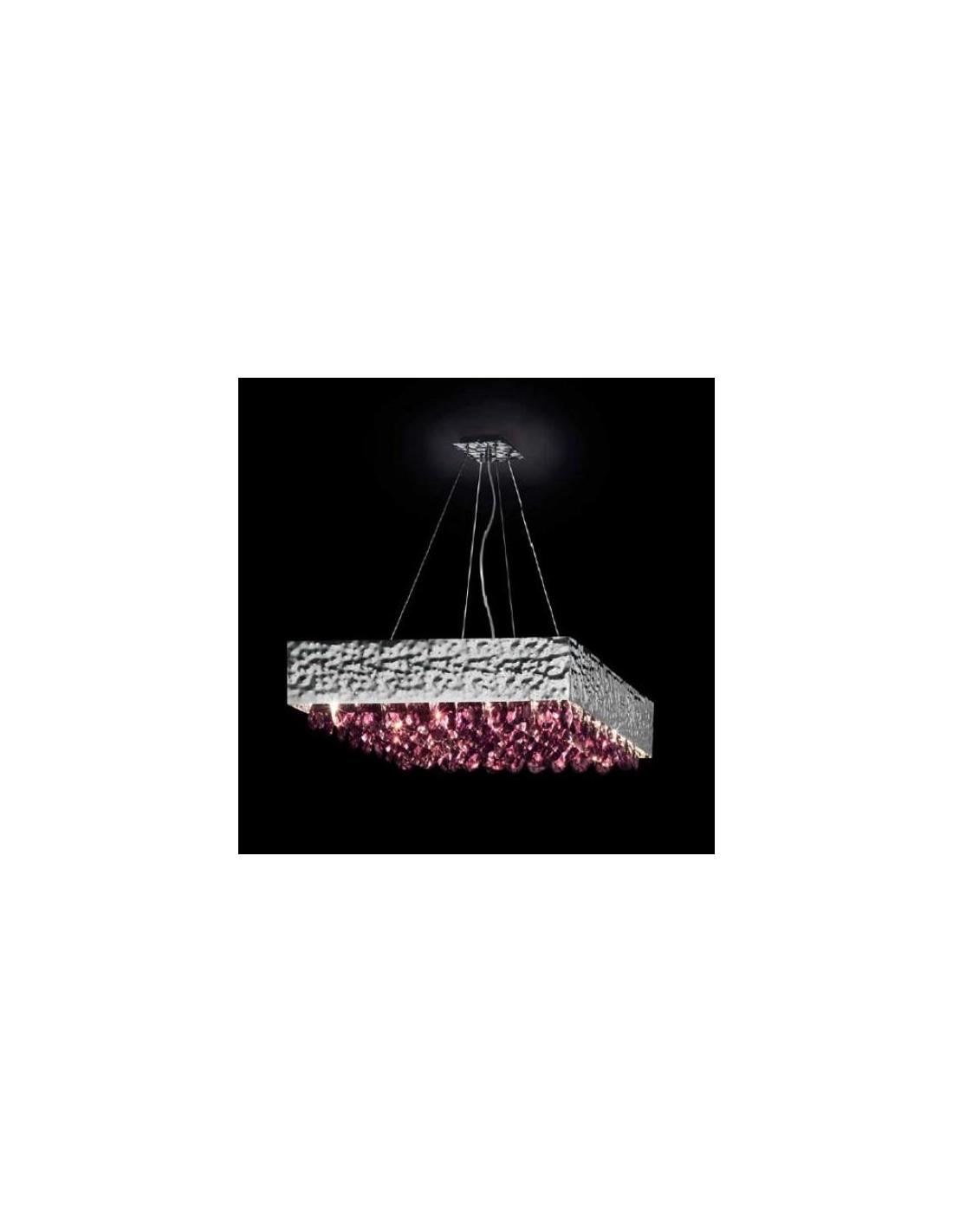 Piantana Magma By Lamp di Patrizia Volpato. Struttura bocciardata in cromo. Corpo con pendagli in cristallo trasparenti molati a mano. Particolari satinati. Portalampada 6xG9, 6x75W max, Altezza 1740 mm, Larghezza 570 mm x 260 mm. Colore cristalli ambra.