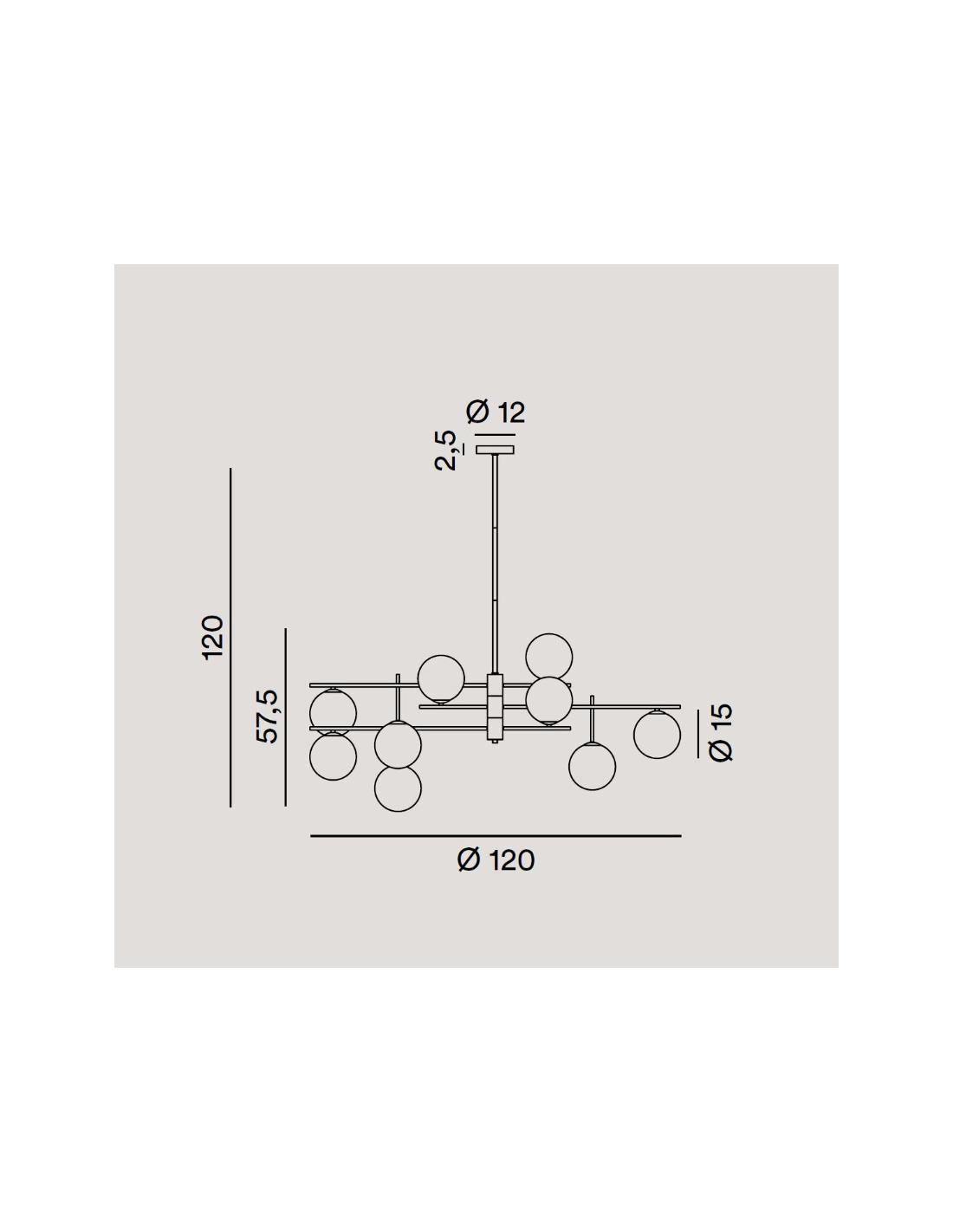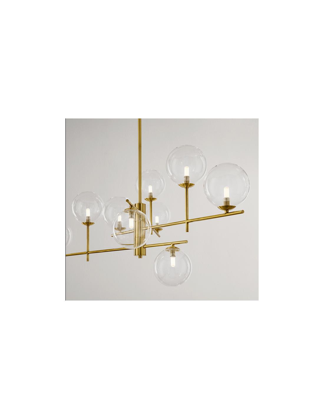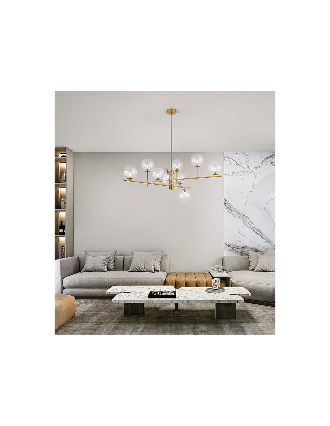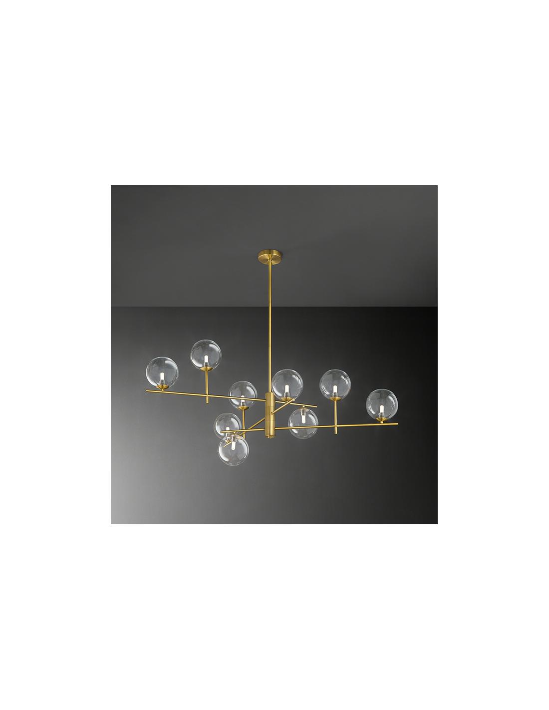 Il lampadario Pyrex dal design elegante con 9 sfere in vetro è una soluzione luminosa di grande impatto scenico, perfetta per valorizzare soggiorni, zone living e ambienti open space.