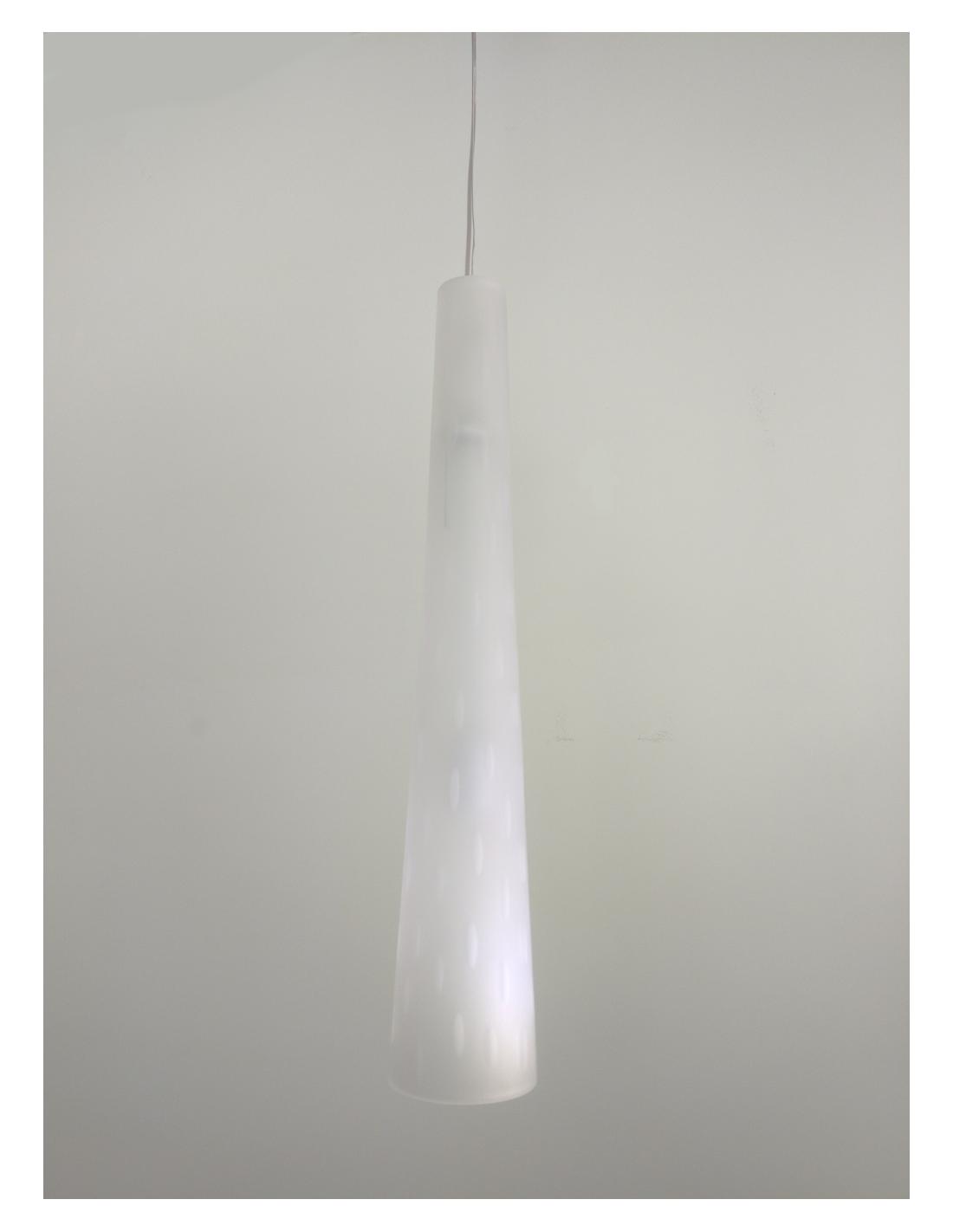 Lampada a sospensione in vetro bianco inciso rigato, dettagli di costruzione in metallo cromato e cavo regolabile in altezza di colore trasparente.