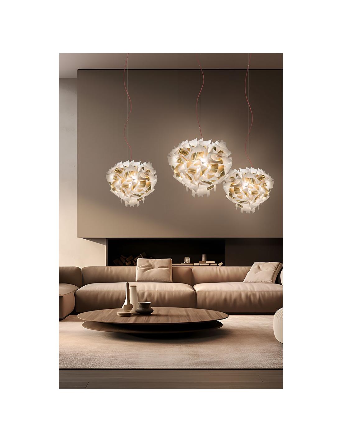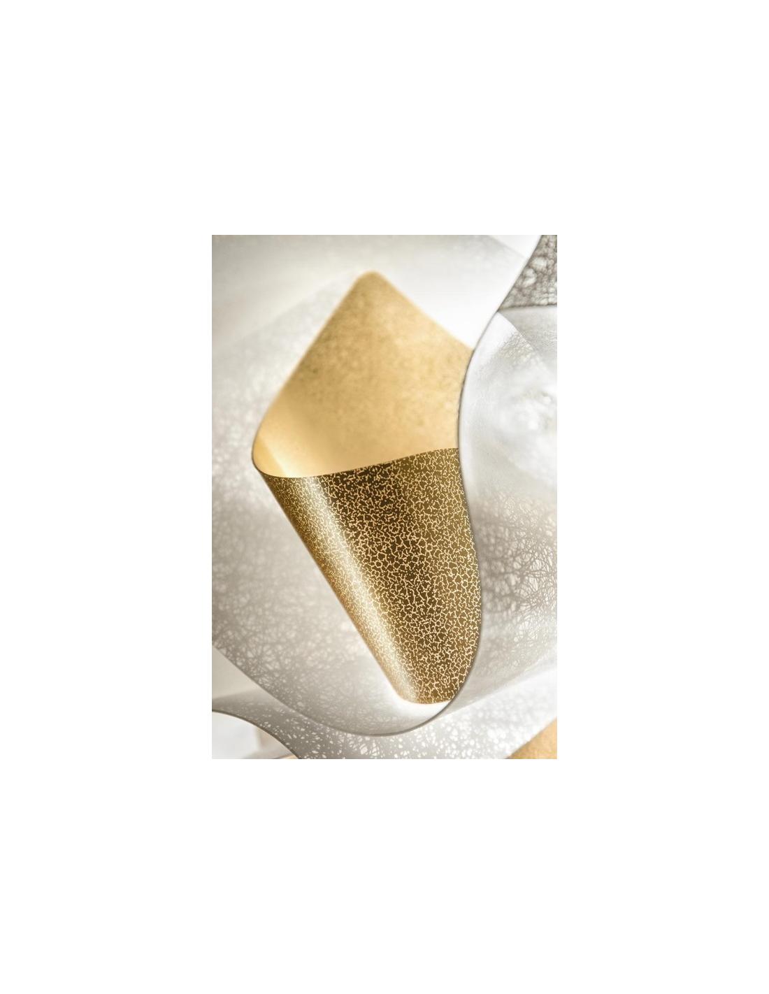 “Veli Aurea”, collezione 2024 dell’iconica famiglia di lampade di design create con tecnopolimeri esclusivi, che si distingue per la texture bianca con intrecci di lamina dorata.