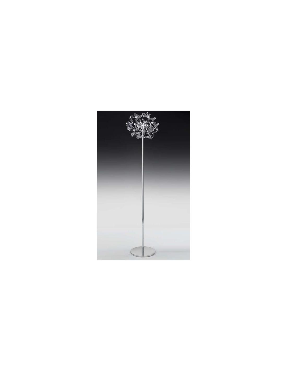 Lumetto con struttura in metallo cromo lucido e riccioli di vetro lilla.