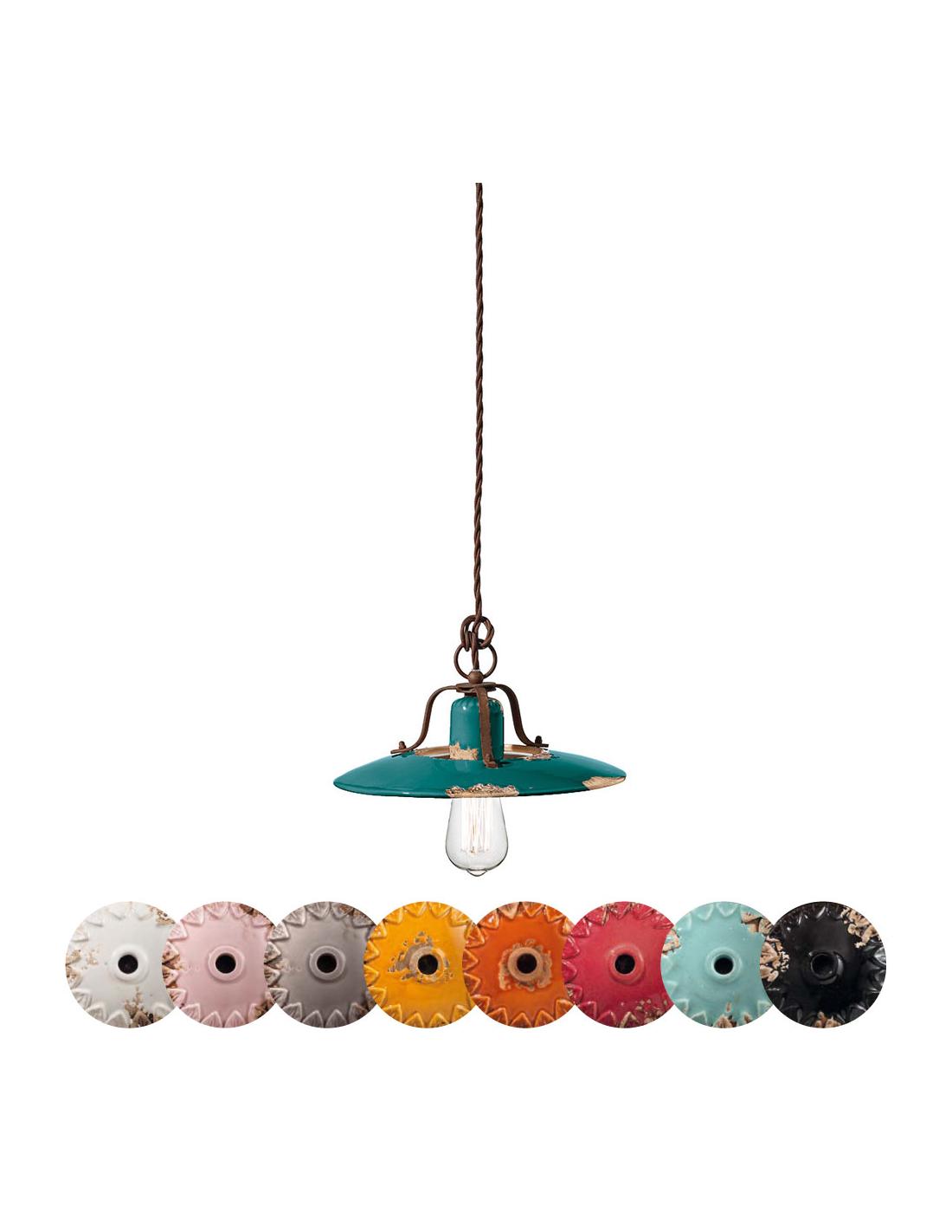 Sospensione 1 luce con particolari in metallo ruggine e diffusore in ceramica vintage verde (VIV). Disponibile in diverse colorazioni.