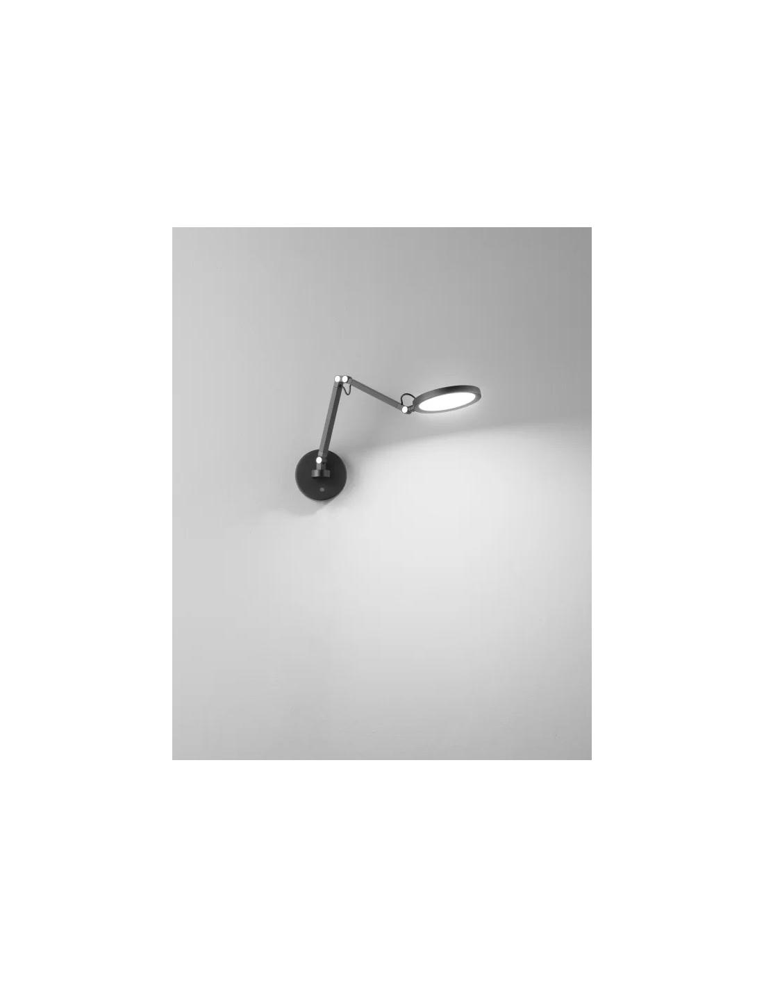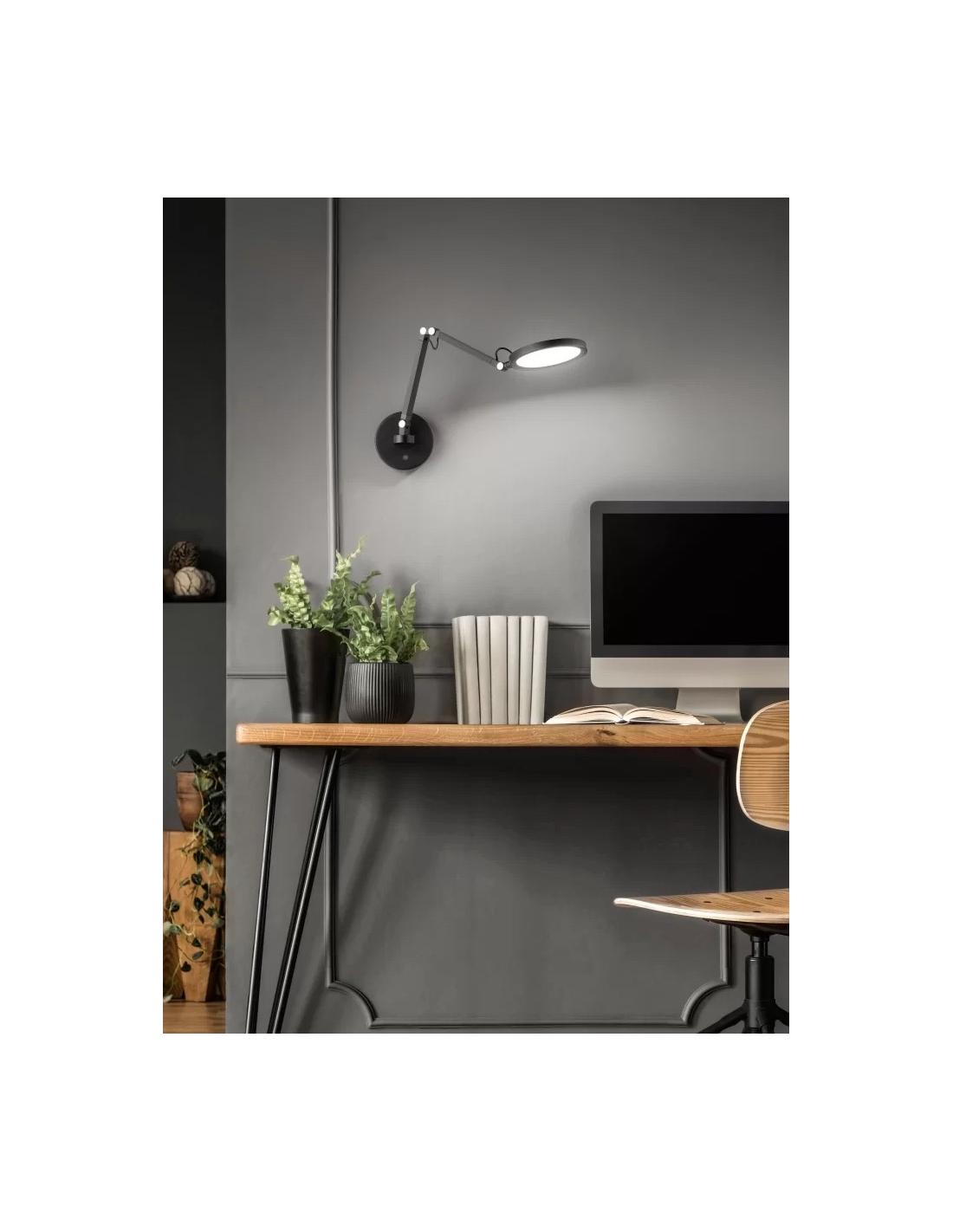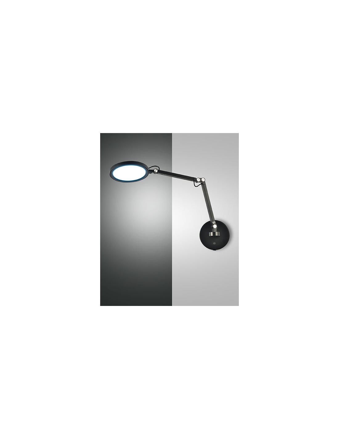 Lampada da parete con struttura in metallo nero e diffusore in metacrilato, con regolazione della luce al tocco e braccio flessibile.